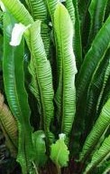 This deciduous perennial fern is a native of Europe, the Middle East, North Africa and northern parts of Asia where it grows in moist limestone-rich soils. North America hosts a tetraploid variety. Light brown scaly rhizomes give rise to clumps of tall thin medium green fronds up to twenty inches long and five inches wide. The tips are usually pointed or crested and the edges straight, undulated, or frilled, all on the same plant. The fronds are erect at first but bend with maturity. They shrivel over the winter and should be cut back before new growth appears. Spore cases appear on the lower surface of the frond in a herringbone pattern. Hart’s tongue fern was named for its resemblance to the tongue of a deer (hart). It is an excellent choice for a cool shady garden but is also a popular houseplant.