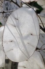 This biennial often grown as an annual is native to the Balkans and southwest Asia and is also called money plant, silver dollars, Chinese coins, and similar, because of its showy seedheads that are round and silvery. It is a member of the mustard family, Brassicaceae, that also includes cabbage, broccoli, and stock. Growing up to 12″ tall, the plant has large leaves that are oval, pointed and coarsely toothed. White to reddish-purple flowers are 1/2 across and borne in the late spring to early summer in terminal racemes. They are followed by flat, translucent seedpods that start out lime green but dry to silvery white. Each pod is one to three inches across and contains three or more seeds. Pods persist into the winter or can be cut for dried arrangements. Plants often reseed and naturalize where conditions are favorable. A good choice for cottage and woodland gardens. The genus name Lunaria, comes from the Latin word luna meaning moon and refers to the appearance of the seed pods. The specific epithet, annua, is the Latin word for annual.
