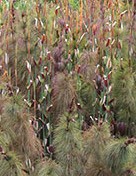 A native of South Africa, Elegia capensis is a rhizomatous , rush-like, evergreen perennial with striking foliage and stature. The needle-like leaves are borne in whorls on the bamboo-like stems and are reminenscent of horsetails, giving rise to the common name. The stems (actually culms) have prominent internodes with nodes marked by large sheaths that pull away from the stem with maturity, revealing a shiny white interior. Small white or greenish male and female flowers are produced in spikes on separate plants in spring and summer and turn brown as they mature. The plant grows slowly for the first three years but then picks up the pace to quickly reach its full height and girth. If space is limited, Elegia capensis is best planted in a bottomless container that will restrict the spread of the rhizomes.