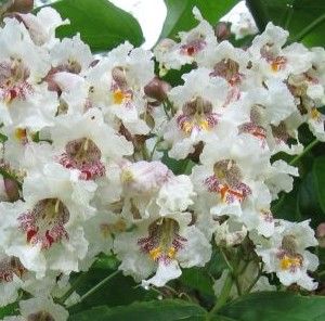 Also called cigar tree, this native of southeastern United States is a deciduous tree with a thick short trunk and pithy, brittle branches that are prone to wind damage. The heart-shaped leaves are up to ten inches long and have an unpleasant odor when crushed. They are purple as they unfurl but turn bright green as they mature. In late spring to early summer, the flowers are produced in upright pyramidal panicles eight to ten inches long and composed of twenty to forty flowers. Each flower is white with purple and yellow spots, and has frilly edges. In autumn the flowers are followed by thin, dark brown bean-like seed pods up to eighteen inches long by ½ inch wide that persist into winter. Each pod contains numerous silver gray seeds that have wings on either side and bear hairs on the ends. To maintain a small size trees are often cut back to a stump in late winter and the resulting shoots thinned to one to three but this procedure will eliminate flowers.