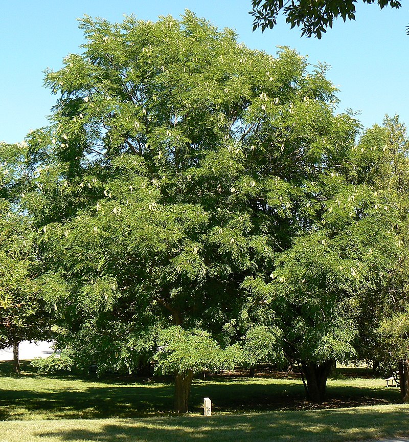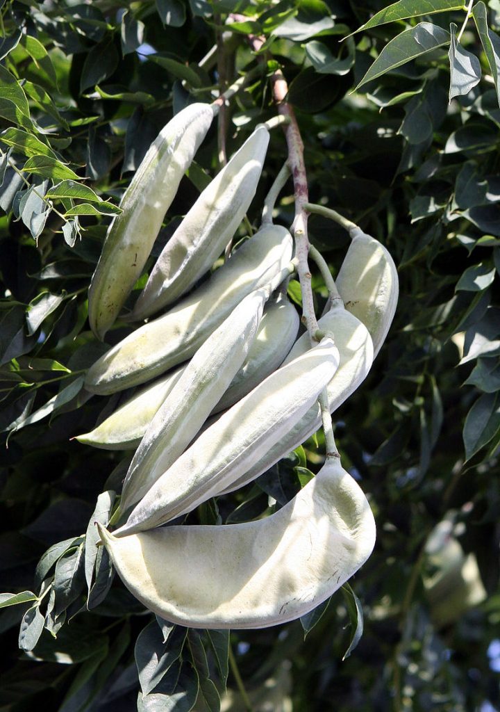 This tall deciduous tree earned its common name from the fact that early American settlers made a beverage from its roasted and ground seeds. Unroasted pods and seeds, however, are toxic. Kentucky Coffee tree is native to the rich moist woods of eastern and Midwestern United States but is planted across the country as an urban shade tree because of its tolerance to drought and pollution as well as its ability to adapt to a large range of soil conditions. It is not related to Coffea arabica, the popular coffee beverage, but is a member of the bean family, Fabaceae, that also includes peas, lupines, and mimosa. The trees grow up to 80′ tall and have several large branches that end in contorted, stout twigs. The bark is rough, scaly, gray-brown and may have irregular furrows and plates with curling sides. Leaves appear late in spring with a touch of pink and gradually turn blue-green in summer, then variable yellow in fall. Each bi-pinnately compound leaf is up to three feet long and two feet wide, bearing up to one hundred small leaflets. In mid to late spring, male trees bear flowers in panicles three to four inches long while female trees bear clusters of greenish white flowers in panicles eight to twelve inches long. The flowers on the female trees give way to brownish black seed pods five to ten inches long and containing several large seeds. The seedpods and large leaves can be considered a liability and male trees are preferred to female to reduce the litter. In spite of the litter problem, Kentucky Coffee tree is a handsome plant and desirable for a lawn and shade tree. It is especially attractive in winter when its branching habit creates a bold silhouette and its rough furrowed bark can be appreciated. The genus name, Gymnocladus, comes from Greek words γυμνός (gumnós) meaning naked, and κλάδος (kládos), meaning a branch, and refers to the branches that are bare many months of the winter. The specific epithet, dioica, comes from the Greek words dis meaning twice, and oikos meaning house, and refers to male and female reproductive structures being on different plants. PhotoCredit MONGO Wikipedia