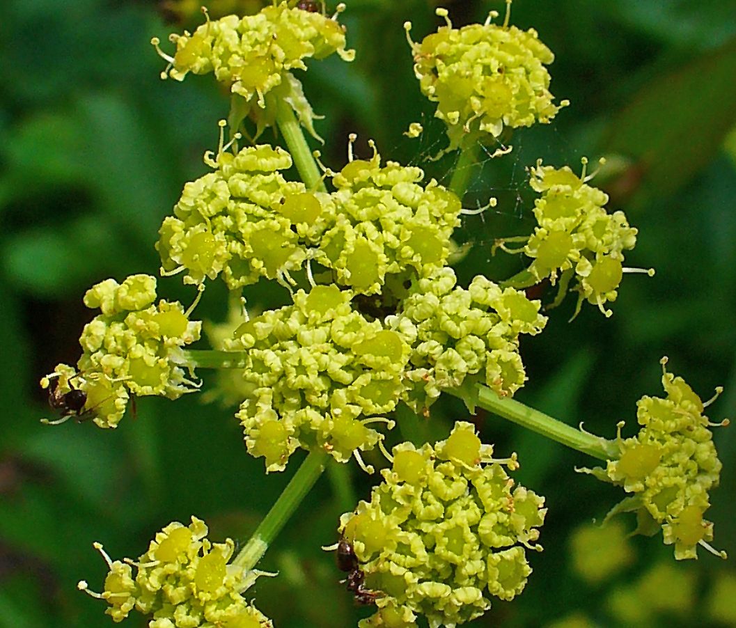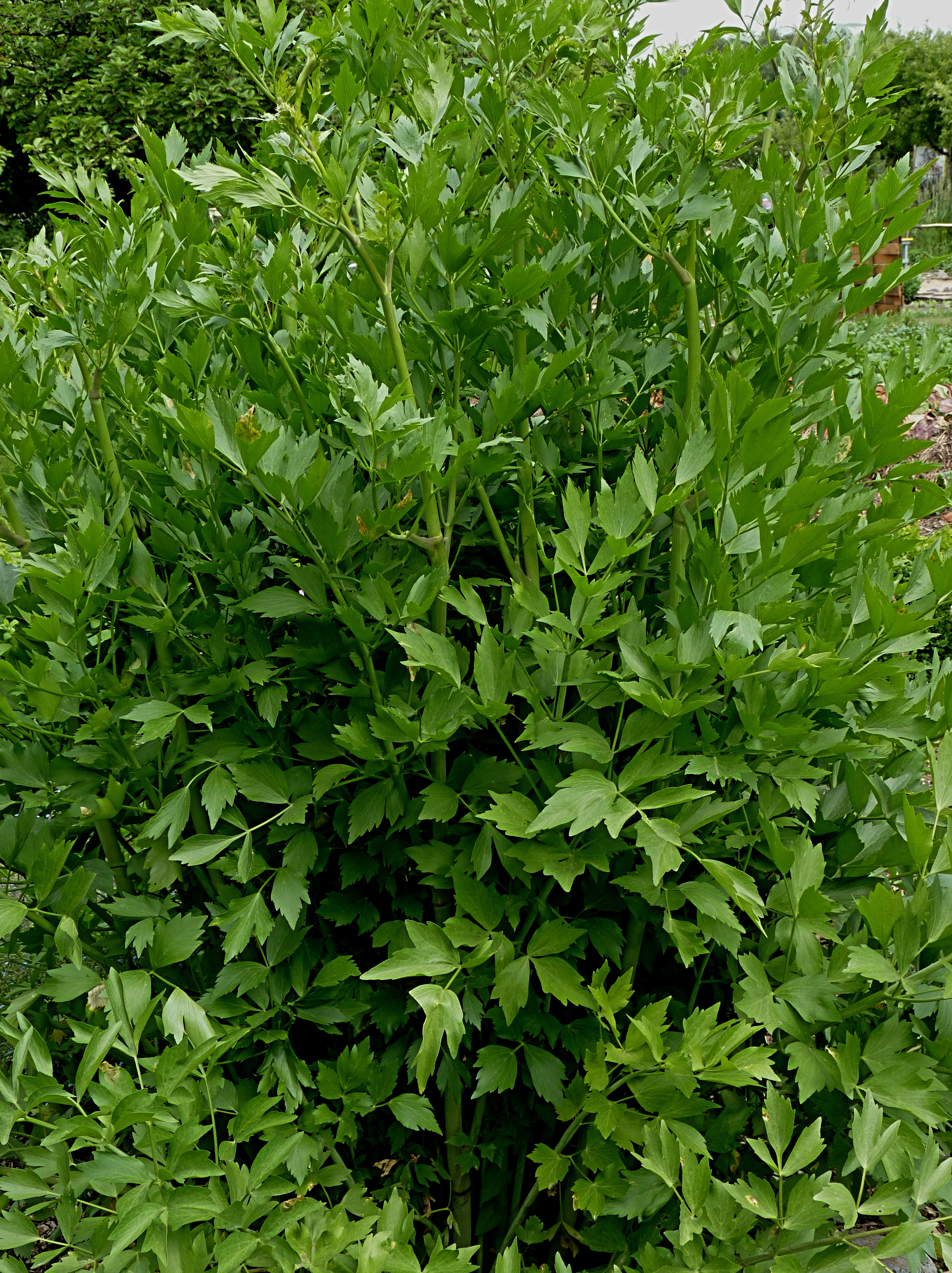 This herbaceous perennial is native to the Mediterranean where it grows wild in the mountainous area of southern France, northern Greece, and the Balkans. It is a member of the carrot family, Apiaceae, that also includes celery, parsley, and Queen Anne’s lace. Although valued in past times for its medicinal benefits there is no medical evidence to support its use for health care and it is now considered valuable primarily as a culinary and aromatic herb. Plants grow 5′-8′ tall from a thick fleshy root 5-6″ long. Hollow ribbed stems branch at the top and have a basal rosette of dark green leaves and smaller stem leaves. The basal leaves are up to 28″ long and are tripinnately compound into wedge-shaped to triangular pointed leaflets with toothed margins and a celery-like aroma when bruised. From late spring to early summer, tiny yellow to greenish flowers appear in terminal globose compound umbels 1.5-5.9 ” across and give way to a dry, very aromatic, 1/4″ long fruits that mature in the fall. Lovage is easy to grow and makes a good background plant in the border but is not striking in appearance. It is best considered a culinary herbs with seeds and leaves being used in such dishes as stews, salads and sauces. The genus name, Levisticum, is a corruptionof the word Latin word ligusticum meaning of Liguira, northwest Italy, where the herb was grown extensively. The specific epithet, officinale, is the Latin word meaning sold in shops, applied to plants that were believed to have medicinal properties.