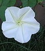 m This perennial flowering vine is native to tropical and semi-tropical regions of the New World in South, Central, and North America. A member of the morning glory family (Convolvulaceae) and should not be confused with other plants with the common name moonflower. It is is the same genus as morning glories (I. tricolor), sweet potato ((. batatus), and cypress vine (I. quamoclit).The vigorous vines grow quickly and climb by twining so are useful on a porch, fence, gazebo and trellise. The leaves are heart-shaped four to eight inches long. The white or pink flowers are fragrant and three to five inches across. They open from four inch long buds suddening in the afternoon or evening and last just one night, but are produced in profusion. Plants flower best when and where summer days are about twelve hours long. The seeds can be collected in the fall for planting in spring when the soil warms up. The genus name Ipomea comes from the Greek words ips meaning worm and homoios meaning resembling, and refers to the twining nature of the plant. The specific epithet, alba, is the Latin word meaning white and refers to the color of the flowers.