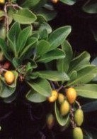 Also known as karaka, this narrow upright evergreen tree grows in coastal and lowland forests of New Zealand. It a shrubby habit with erect or spreading branches. The large leathery oblong leaves are shiny , dark green, and 6-8 inches long by 2 ½ to 3 ½ inches wide. In spring, tiny greenish to off white flowers are produced in erect panicles. The fleshy fruits that follow in late summer are ½ to 1 ½ inches long and yellow to orange in colored when mature. The pulp is edible but the single seed is very poisonous. The generic name, Corynocarpus, comes from Greek words korne meaning club and carpos meaning fruit and refers to the shape of the fruit. The specific epithet, laevigatus, comes from the Latin word meaning smooth and refers to the leaves. The plant is a good choice for a hedge, screen, or espalier, and its foliage is excellent in flower arrangements.