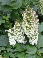 Oakleaf hydrangea is a deciduous stoloniferous shrub native to the Southeast US where it grow in moist woodlands. It is a member of the Hydrangeaceae family that also includes mock-orange and Deutzia. The branches are exfoliating and provide winter interest. The dark green, oak-like leaves are large, lobed, coarse, and handsome in spring and summer but really put on a show in the fall when they turn shades of burgundy. The flowers are produced in long pyramidal panicles four to eight inches long in early to mid summer They emerge white and slowly become shades of pink as they age. Flowers are produced on old wood so prune immediately after flowering. Although hardy in zone 5 the tops may be killed to the ground or the buds frozen resulting in poor flowering. Good cut flower.