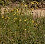 Native to woodland edges of southcentral US, this little known herbaceous perennial is also called as rosinweed sunflower. It is a member of the aster family, Asteraceae, that also includes daisy, yarrow, and lettuce. Plants have a fibrous root system with short rhizomes and central sparingly branched stems that are 3-10′ tall, hispid below, and may be light green, light yellow, or light brown. The oval to ovate leaves are mostly at the bottom of the stems and are up to 6″ long. They tend to be medium green to yellow green above, have finely toothed margins, and are sparsely covered with small stiff hairs. Leaves on the upper parts of the stem are conspicuously smaller in size. For 3-4 weeks beginning in late summer, flowerheads appear either singly or in small loose clusters of 2-3. Each flowerhead is 2-3″ wide and consists of 8-20 bright yellow ray flowers surrounding a central disc of 75 or more red disc flowers. The flowerheads are attractive to butterflies and bees and the seedheads are attractive to birds. Ozark sunflower is valued for its abundance of flowers and its relatively non-aggressive manner which make it a desirable choice for wildflower, native plant, butterfly, wildlife and cottage gardens. The genus name, Helianthus, comes from the Greek words helios, meaning sun, and anthos meaning flower and may refer to the resemblance of the flowerhead to the sun. The specific epithet, silphioides, refers to the resemblance of Ozark sunflower to plants in the genus Silphium, also tall perennials in the aster family.