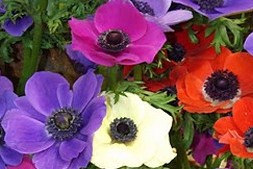 This tuberous short-lived perennial is native to the Mediterranean and a member of the buttercup family (Ranunculaceae) that also includes delphinium, clematis, and hellebore. The poppy-like flowers lack petals but have red, white, or blue showy sepals surrounding a dark center. They are carried singly on stems six to eighteen inch tall in early spring. Both single and double flowered cultivars are available. The medium green leaves are 1-2″ long, divided, and fern-like but disappear in the summer when the plants go dormant. Poppy anemone can be grown in containers and is an excellent cut flower. The genus name, Anemone, is probably a corrupted Greek loan word of Semitic origin referring to the lament for the slain Adonis or Naaman, whose scattered blood produced the blood-red Anemone coronaria. The specific epithet, coronaria, comes from the Latin word corona meaning crown, garland or halo. All parts of the plant are poisonous when fresh.