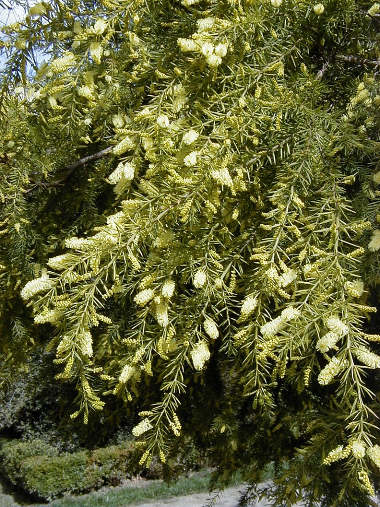 Also known as prickly-leaved wattle, star-leaved acacia, prickly mimosa, and whorl-leaved acacia, this flowering evergreen shrub or small tree is native to southeast Australia including Tasmania. It is a member of the legume family, Fabaceae, that also includes pea, lupine, and alfalfa. The plant grows up to 33′ tall and has young shoots that are hairy and angularly ridged. Instead of leaves, the plant has dark green, spine-like phyllodes that are 1⁄3-5⁄8 ” long and grow on the stem in whorls of 6. From winter to spring, 1-3 cylindrical spikes of flowers appear in the axils of the phyllodes. The spikes are 1⁄2 to 1 1⁄8″ long and densely packed with light yellow flowers. The fruit that follows is a papery, dark brown, flat seed pod that is 1 1/2 to 3″ long, often curved, and lightly hairy. Prickly moses is valued for it use as a hedge, screen or bird habitat, and is a good choice for bird, wildlife, and winter gardens. The genus name, Acacia, comes either from the Greek word akazo meaning to sharpen or from the Egyptian word akakia, a name given to the Egyptian Thorn, Acacia arabica. The specific epithet, verticillata, is from the Latin word vertigo meaning turning and refers to the whorled arrangement of the phyllodes.