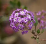 Also known as beach sand verbena and purple sand verbena, this tender perennial is often grown as an annual and is a member of the four o’clock family, Nyctaginaceae, that also includes bougainvillea. It is native to the west coast of North America from British Columbia, Canada, to Baja California, Mexico where it is found on beaches and sand dunes below the coastal sage scrub. The trailing plant forms a low leafy mat and sometimes has reddish purple stems that are 6-24″ long, 1-2″ high, and root easily as they grow. The stems carry thick succulent leaves that are 2.5″ long, ovate to diamond-shaped, and usually covered with short glandular hairs. During most of the growing season the plants produce short stalks carrying 2″ wide spherical clusters of 10-15 flowers subtended by 5-8 lanceolate bracts. The flowers lack petals but the calyx has 10-16 showy petal-like lobes that are purplish pink and white at the base. Prostrate sand verbena is a good choice for a groundcover, erosion control on beaches, as well as for rock, native plant, and wildflower gardens. The genus name, Abronia, comes from the Greek word ἀβρός (abros), meaning delicate and refers to the appearance of the bracts subtending the flower clusters. The specific epithet, umbellata, comes from the Latin word umbella, meaning a sunshade, parasol, or umbrella and refers to the arrangement of flowers on the stem that resembles the ribs of an umbrella.