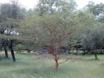 Also known as shittah tree, this evergreen tree is native to parts of northern Africa including Senegal, and Egypt where it grows in woodlands, wooded grassland, subtropical and tropical deserts, dry forest areas, lowlands, along watercourse, and near waterholes or seasonally flooded black cotton soils. It belongs to the legume family, Fabaceae, that also includes peanuts, sweet pea, and black locust. The tree grows up to 55′ tall although under 30′ in cultivation, and has a deep tap root, rust-colored powdery bark, and horizontal branches with large straight spines except on the tips where the spines are curved. The dark green, bipinnate leaves are 3-4″ long and have 10-12 pairs of leaflets about .5″ long. Rounded clusters of bright yellow flowers appear on 1″ long stems in the leaf axils during the dry season and give rise to light brown dry pods 4-6″ long containing several seeds. The tree is highly valued as an ornamental, and for fodder, wood and gum arabic, and has been used in folk medicine to treat a variety of ailments including dysentery, eye inflamation, rhinitis, bronchitis, arthritis, and hemorrhaging. The genus name, Vachell, honors George Harvey Vachell (1789-1839) chaplain to the British East India Company in Macoa, plant collector in China. The genus name, Acacia, is from the Greek word akis, meaning a point or a barb and refers to the thorns. The specific epithet, seyal, comes from an Arabic word for “torrent” used for the species in Egypt and refers to its association with water courses there.
