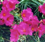 Rock purslane is a tender perennial usually grown as an annual. Native to western North America it is a member of the Montiaceae family that also includes Lewisia and Claytonia. Plants form 6″ tall compact mounds of branching, semi-upright steams bearing evergreen, linear to lance-shaped leaves that are fleshy and grey-green. In summer, loose panicles of magenta flowers appear that are cup-shaped and 3/4″ in diameter. Plants like cool temperatures and do especially well in California and the Northwest. A good choice for rock gardens, scree, and containers. The genus name, Calandrinia, honors Jean Louis Calandrini, an 18th-century Swiss botanist. The specific epithet, umbellata, comes from the Latin word umbella, meaning a sunshade, parasol, or umbrella and refers to the arrangement of flowers on the stem that resembles the ribs of an umbrella.