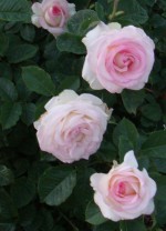 This popular exhibition rose has large flowers that open from fat buds and are usually borne singly on long stout stems. The long petals are white on the reverse and pink inside, often with dark pink edges. In hot weather they change to pearly pink and may fade to white. At their best, the flowers are high centered but can have split centers and, less frequently, sunken centers, concerns of exhibitors. The bushes are upright with large healthy matte medium-green leaves. Generally considered disease resistant, ‘Moonstone’ can have rust problems. It prefers dry weather because rain damages its blooms, and is good for beds, borders, and cut flowers.