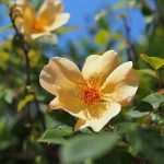 Pointed buds open to single, lightly cupped flowers up to 3″ across with petals that are a mixture of copper, orange, and apricot. The petals tend to be lighter and more yellow towards the base and pinker and darker on the edges. In the center is a mass of unevened length gold to amber stamens. The flowers are fragrant and appear in flushes throughout the season. The erect compact bushes are vigorous, healthy, and have crimson new growth, glossy dark green leaves, and large prickles. ‘Mrs Oakly Fisher’ can be grown in a container or used in a border where its compact growth habit and flower color fit in easily with other plants.