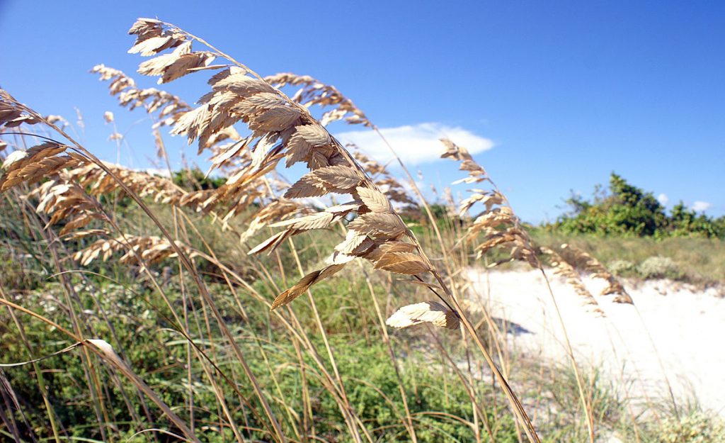 Also known as spike grass, this warm season perennial grass is native to coastal beach communities of North America from Virginia to Florida west along the gulf to Texas and northern Mexico, but is rare and endangered in most areas. It is a member of the grass family, Poaceae, that also includes corn, rice and bamboo. The rhizomatous plants form dense colonies 3-8′ tall consisting of arching, gray-green, somewhat sharp-edged leaves that are 1/4-1/2 ” wide and 8-16″long. Throughout the growing season, long arching stems carry showy panicles of pendent, flat, green flower spikelets that turn brown and persist into winter. The plants are tolerant of moderate drought, heat, wind, and saline conditions but not pollution, foot traffic, or water logged soil. They are valued for stabilizing soil, controlling erosion and providing a habitat for birds and other wildlife. The flowering stems are beautiful in fresh and dried arrangements. The genus name, Uniola, is of uncertain origin but might be derived from the Latin word unus meaning one. The specific epithet, paniculata, is from the Latin word panicula meaning tuft and refers to the inflorescence.