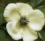 Bloom: White, five-petaled flowers about three inches across with a center of forty to fifty purple stamens, in summer