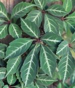 Also called Chinese Virginia creeper, this deciduous climber is native to China where it grows on moist rocks, clifts, and hillsides. It is a member of the grape family, Vitaceae, that also includes Boston ivy. Plants grow rapidly and may become 20-30′ long trailing along the ground or climbing on other plants or structures by means of strongly adhesive disks located at the end of the tendrils. The palmately compound leaves have 5-9 leaflets that are up to 5″ long and have conspicuous white veins. They are purplish green when they emerge, green tinged with bronze in the summer with maroon undersides, and bright orange, red and purplish in autumn. In spring inconspicuous clusters of greenish flowers appear and later give rise to fleshy black fruits that are attractive to birds. Although a vigorous plant, it has a more restrained growth than its relatives Virgina creeper and Boston ivy but offers attractive foliage in both spring, summer, and fall. It is a good choice for controlling soil erosion especially on hillsides, and growing in containers and on walls, trellises, arbors, other garden structures and unsightly objects. The genus name, Parthenocissus, comes from the Greek words, parthenos, meaning virgin, and kissos, meaning ivy, and refers to the first word of its English vernacular name, Virginia creeper, honoring Queen Elizabeth I who was known as the Virgin Queen. The specific epithet, henryana, honors Irish botanist and plant collector Augusting Henry (1857-1930) who discovered the species in central China in the 1880s.