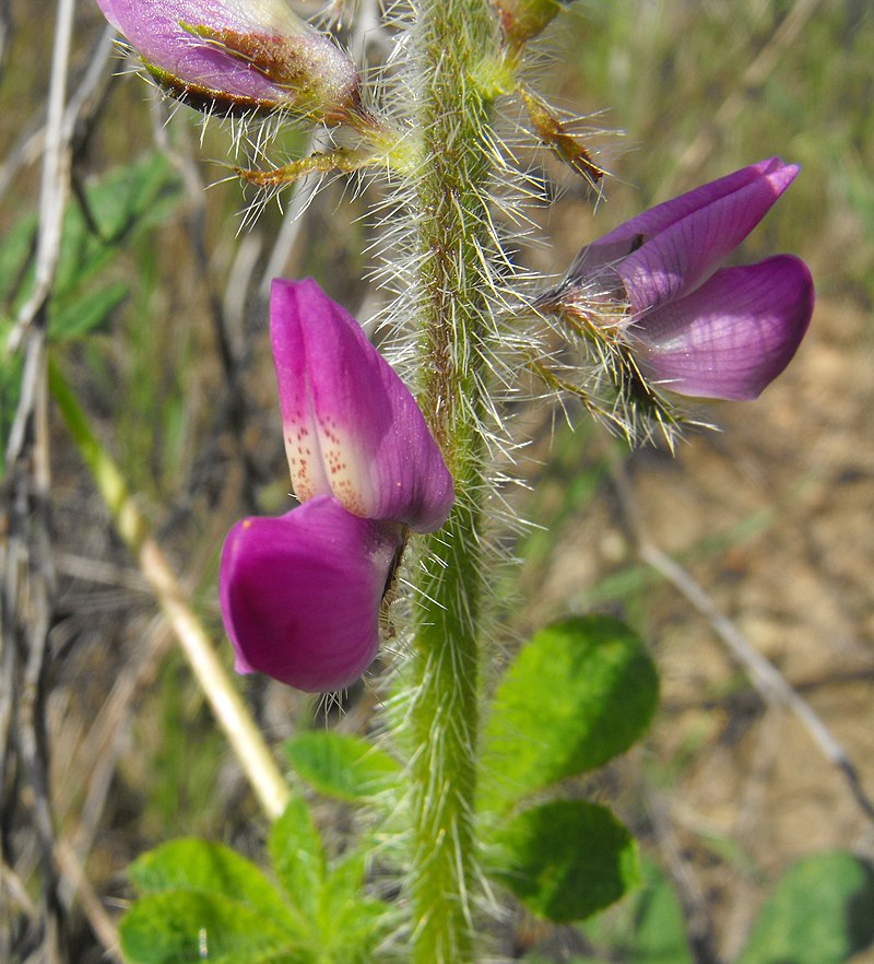 Native to dry rocky slopes of the coastal mountains of California and Baja California, this herbaceous annual is a member of the legume family, Fabaceae, that also includes beans, mimosa, and black locust. it grows 1-3′ tall, occasionally taller, and has long stiff hairs on the stems and leaves that sting like nettles when touched. The palmate leaves are made up of 5-8 leaflets that are up to 5″ long. In spring 4-12″ long racemes bear flowers attractive to butterflies and bees, including bumble bees. The pea-like flowers are 1/4-1″ long and are purple to dark pink with a yellowish to pinkish spot on the banner. The fruit is a hairy pod, .8-1.6″ long, contains 3-6 seeds, and provides food for birds. The genus name, Lupinus, is derived from the Latin word lupus meaning wolf, and refers to the false belief the plants destroyed the soil. The specific epithet, hirsutissimus, is the Latin word meaning very bristly or prickly, and refers to the stinging hairs on the plant. Photo Credit NPS Wikimedia Commons