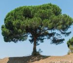 Also known as umbrella pine and parasol pine, this coniferous evergreen tree is native to the Mediterranean region including southern Europe, Israel, Lebanon and Syria. It is a member of the pine family, Pinaceae, that also includes spruce, hemlock, and larch. The trees may grow 30-80′ tall but usually no taller than 65′. They have a thick trunk with red-brown fissured bark and are branched to form a wide flat canopy at maturity. Small blue green juvenile needles are produced singly for the first 5-10 years and when the plant is injured, but are replaced gradually by stiff mid-green needles 4 to 8″ long and produced in bundles of two. Rounded-ovoid male and female cones are produced on the same tree and are shiny light brown, about 3-6″ long, and have blunt scales. Fertilized female cones produce edible nuts three years after being fertilized. Each nut is about 3/4″ long, pale brown with a black powdery coating that easily rubs off, and a ineffectual wing. Stone pine has been cultivated for over 6,000 years for its pine nuts but are also valued for their ornamental appeal, especially in parks and other public spaces. Small plants are used for table Christmas trees and bonsai. The genus name, Pinus, and specific epithet, pinea, both come from the Latin name for the tree.