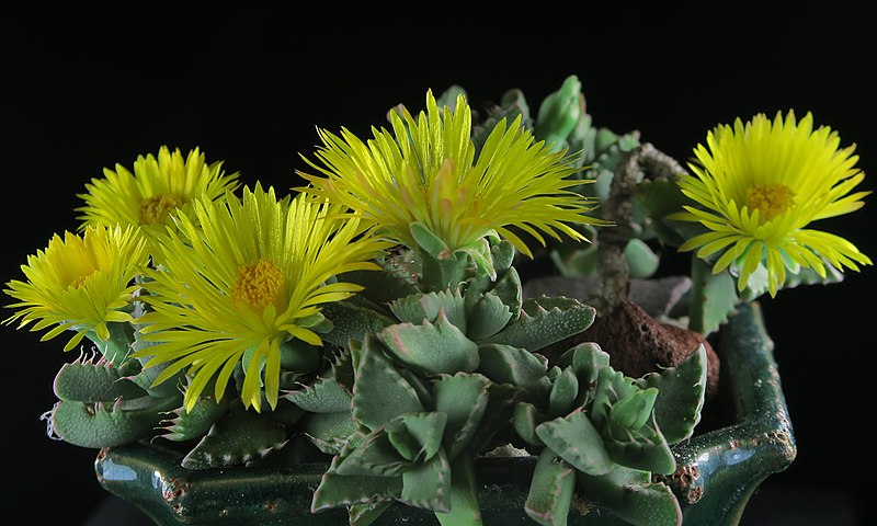 Native to hot, dry areas of the Eastern Cape province of South Africa, this clump-forming succulent perennial is a member of the fig-marigold family, Aizoaceae, that also includes ice plant, living stones, and New Zealand spinach. The plants grow 3″ tall and form a rosette of thick, crowded leaves that are up to 1.5″ long, triangular in shape, and green to gray-green with distinct white flecks and sometimes tinted with red. The margins of the leaves have 9-10 soft teeth with long soft bristles and resemble the open jaws of a tiger but are useful for collecting moisture from the air and sending it to the roots. From fall to early winter, 2″ wide, yellow, daisy-like flowers appears with 100-120 long, thin, silky petals that are actually modified stamens. Tiger jaw is easy to grow and makes an interesting specimen for a dish garden but can be grown in a rockery in warm climates. The flowers open about noon and close at night. The genus name, Faucaria, comes from the Latin word faux meaning jaw and refers to the appearance of the leaf margins. The specific epithet, tigrina is the Latin word for tiger.