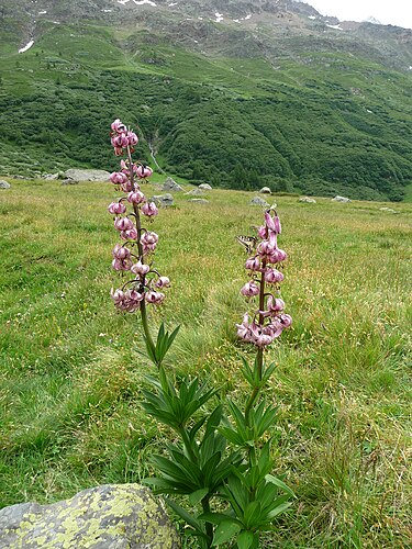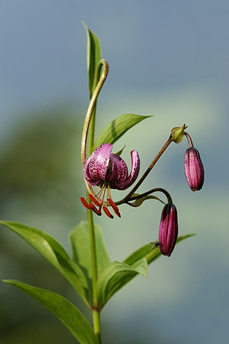 Known since 1568, this herbaceous perennial is a native of Europe and Asia. It is a member of the Liliaceae plant family that also includes tulips, fritillaries, and Quamash. Plants grow 3-4′ tall from a bulb and have whorls of lance-shaped leaves up to 6″ long. In summer, the top half of the stem produces up to 50 flowers that are white to pink, sometimes with maroon spots, very fragrant and attractive to butterflies and other pollinators. Each flower is 2-3″ across and has 6 recurved petaloid tepals. Plants resent being moved and may sulk for the first year. The genus name, Lilium is the Latin name for lilies. The specific epithet, martagon, may come from Ottoman Turkish word mārtağān, a special kind of turban adopted by Sultan Muhammed, and refers to the appearance of the flowers.