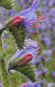 Viper’s bugloss is an herbaceous biennial native to Europe and parts of Asia where it grows in dry lean soil including waste areas and sand dunes. It has been introduced to North America and is considered an invasive species in Washington state. Viper’s gloss is a member of the borge family (Boraginaceae), which also includes forget-me-nots, heliotrope, and lungwort. The rough oblong leaves are hairy and form a rosette from which the flower spike emerges from summer to fall. Pink buds open to bright blue flowers with protruding stamens. The stamens have red filaments and carry blue pollen. The flowers are very attractive to bees. Although a biennial, plants are best started early and grown as an annual. Several cultivars are available including white and pink flowered ones. The generic name Echium is from the Greek word echis meaning viper and refer to the appearance of the flowers. The specific epithet, vulgare, is from the Latin word vulgis meaning common.