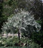One of the prettiest trees for a small garden is the weeping willow-leaf pear. Its small size and fine-textured silver-green foliage are enough to recommend it but it has even more to offer. In spring, pink tipped flower buds emerge and open to white flowers before the leaves appear. The leaves have a silver color at first but gradually turn a silver green color that is outstanding among silvered leaved trees. After the leaves drop in the fall, the lovely weeping habit can be enjoyed until spring when the flowers and new leaves emerge. Unfortunately this gem of a tree is susceptible to fire blight, as many other pears and apples are. It does best where summers are cool.