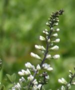 White false indigo is a herbaceous perennial and a member of the legume family, Fabaceae, that also includes peas, mimosa, and lupine.it is native to North American where is grows in dry meadows and forest edges. Plants have a deep tap root and stout sparsely branched stems that grow three to sex feet tall. The greyish/blue green leaves are obovate to oblanceolate, hairless, and compound with three leaflets that are two inches long and pointed at both ends. Racemes up to two feet long carry 1″ flowers that are white sometimes tinged with purple. The flowers appear from late spring to mid-summer and give way to green seedpods that are two inches long and turn black with maturity. The generic name, Baptisia, comes from the Greek word bapto meaning to dip or dye and refers to the flower extract once used as a substitute for indigo. The specific epithet, leucantha, comes from the Greek words leukos meaning white, and anthos, meaning flower, and refers to the color of the flowers.Type: Herbaceous perennial