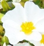 White rock rose is a dense evergreen shrub native to southern Europe resulting from a natural cross between C. salviifolius and C. populifolius. It is a member of the Cistaceae, a small plant family of about 200 species in 9 genera, only one of which, Cistus, being well known. Plants grow 2-4′ high and if given plenty of room may spread to 12″ wide. The oval dark gray-green leaves are 2″ long, downy, and crinkly, and have wavy margins. They are fragrant on wrm days. In late spring to early summer, red buds at the tips of the downy branches open to 1.5″ wide flowers with 5 white petals tinged with yellow at the base surrounding a center of yellow stamens. Plants are fire resistant, and tolerant of drought, salt, heat and poor soil, so are a good choice for xeriscapes, borders, groundcovers, as well as seaside, rock and Mediterranean gardens. The genus name, Cistus, is from the ancient Greek word κίσθος (kisthos) meaning basket.Type:Flowering evergreen shrub