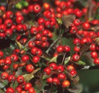 This medium-sized native tree of central and southeastern United States provides interest in spring, fall and winter. In early spring two inch wide clusters of small white flowers make a showy display and are followed by simple dark green leaves that turn purplish red in the fall. The fruits also mature in the fall to bright red berries that persist on the tree through winter. The grayish-brown bark exfoliates and reveals an orange layer beneath. The tree can be used as a specimen or pruned into a screen or hedge that is a real barrier because of its one and one half inch thorns. The berries are attractive to the birds, the flowers and leaves to several butterfly adults and larvae, respectively. Although more disease resistant than other hawthorns, it may have problems in this regard.