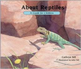 Kids love finding a turtle in the garden but what about a snake? Cathryn Sill’s book About Reptiles, show young readers that turtles and snakes as well as alligators and lizards all have certain characteristics in common and are part of the same group called reptiles. Written for young elementary students up to grade 2, the book provides an introduction to the subject as well as a close look at fifteen different reptiles.