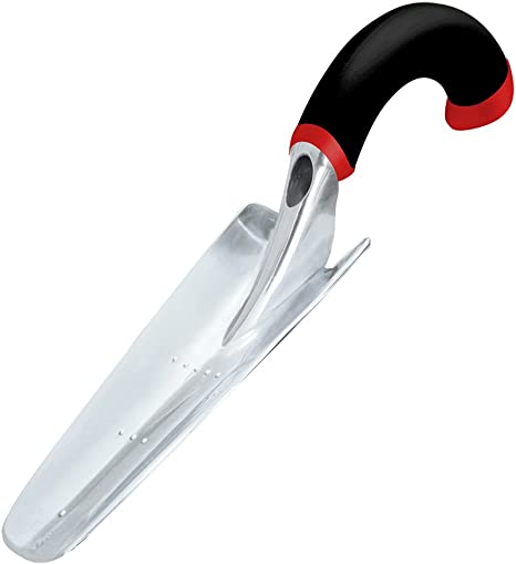 This trowel, made especially for transplanting, features a long narrow blade that is gently curved and pointed at the tip. Some transplanters blades have two sharp edges, while others may have one serrated edge. In addition, some blades may have marking that indicated the distance from the tip in inches. The blade is usually of a metal such as steel alloy, stainless steel, or aluminum. The handles may be of wood or metal, and may include various safety features such as finger guard and thumb rest. Some handles are especially designed for comfort and easy of handling. Photo Credit Amazon