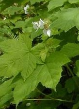 Another native species, known as thimbleberry, is found on the west coast of North America from Alaska to Mexico., east to the Rocky Mountains. Its thornless stems carry deeply lobed, velvety leaves up to ten inches long and produce 2-2 ½ inch wide flowers with white slightly crinkled petals in mid- to late spring. The edible fruit looks similar to a small raspberry but is softer so does not pack well and is not grown commercially. Plants often form clumps or dense thickets by rhizomes.