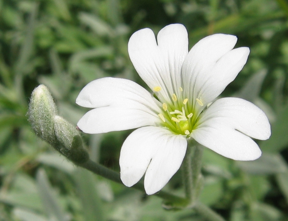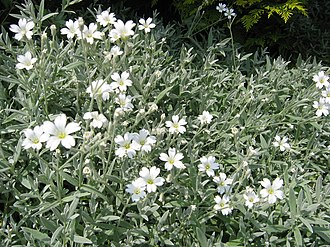 Native to southern Italy, this short-lived perennial is a member of the carnation family, Caryophyllaceae, that also includes pinks, baby’s breath, and chickweed. The spreading plants form mats of densely hairy, silvery-grey stems and leaves up to 6″ tall. The leaves are lanceolate, up to 1″ long, and evergreen. In early summer, clusters of up to 15 white flowers appear on wiry stems 8-12″ tall. The star-like flowers are up to 1″ across and have 5 deeply notched petals. Snow-in-summer is drought resistant but does best in areas with cool dry summers. It spreads by self-seeding and underground runners and can become invasive but is useful as a groundcover, edging, and xeriscape, as well as in rock, wall, and cottage gardens.