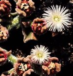 This evergreen prostrate annual or biennial is native to southern Africa, Sinai, Canary Islands, and southern Europe where it grows on cliffs, coastal bluffs, sand dunes and disturbed areas. It is a member of the fig-marigold family, Aizoaceae, that also includes New Zealand spinach and “living stones” but is not closely related to either figs or marigolds. Plants grow up to 8″ tall and have 4″ long oval fleshy leaves that are green or red, have wavy margins, and are covered globular bladder cells that reserve water and glisten like ice in the sun. From spring to early summer, white to pale pink flowers appear. They are 3/4-1 1/4″ across, have thin narrow petals, and resemble sea anemones. The flowers open during the day and close at night. Crystalline ice plant accumulates salt in the soil that inhibits the growth of native plants and is considered invasive in parts of California. With proper care, however, it can be successfully used as a groundcover, and in container, rock or seaside gardens.