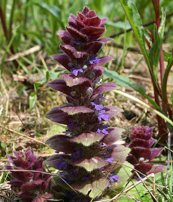 The slowest growing of these three ajugas, A. pyramidalis is upright and has dark green leaves three to four inches long . The dense flower spikes are four to six inches long and have large purple bracts pressing up against the bright blue flowers. May form stolons in fall.
