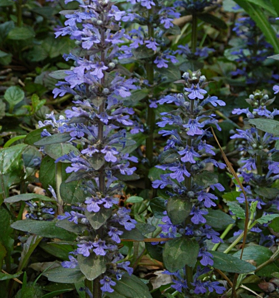 Vigorous and fast growing, this stoloniferous prostrate species can quickly overtake a lawn so use it away from areas where it will not be appreciated. The leaves are two to three inches long and dark green or bronze. Flowers are blue and produced on dense spikes. Breeding programs have produced many excellent cultivars that vary in both flower and leaf color, and are less spreading than the species. A. reptans can tolerate dry conditions better than the other ajugas.