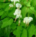 lso known as redwood ivy, this native of northwestern California and southwestern Oregon grows in coastal forests, especially redwood forests. The plants grow up to 12″ tall from a rhizomatious root system and form a clump of leathery, glossy dark green compound leaves with 3 or 5 round to heart-shaped leaflets up to 1.5″ long and wide, on long reddish petioles. In winter the leaves may take on a purplish to red color. The small pendent flowers appear in upright clusters of 20-50 in late spring to early summer. Each flower has 6 petal-like sepals that are white and reflexed, and 6 smaller white petals that are sometimes tinged with lavender. Although the plants prefer moist soils in the shade, they tolerate dry soil and are a good choice for a ground cover or in woodland, native plant, or shade gardens.