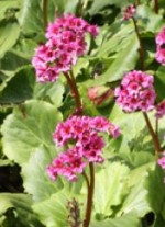 Bergenia is genus of semi-evergreen herbaceous perennials and belong to the saxifrage family, Saxifragaceae, that also includes Astilbe, Heuchera, Tiarella, and Rodgersia. It is native to central Asia but is a popular garden plant because of its attractive foliage and flowers. Plants have a rhizomatous root stock and form clumps of bold, paddle or oar shaped leathery leaves that turn red or bronze in the fall where the climate is cool. Waxy pink cone-shaped flowers 1.4″ to 1/2″ across appear in spring in dense upright clusters 5-6″ tall. The common name pigsqueak comes from the sound made when two leaves are rubbed together. The genus name, Bergenia, honors Karl August von Bergen, 18th century professor at Frankfurt an der Oder.Bergenias like moist, humus-rich, well-drained soil in full sun to light shade and tolerate alkaline soils and drought. In the North they can be planted in full sun but in the South the leaves need protection in the afternoon. Leaves can become damaged by both slugs and cold. The flower buds are more sensitive to cold than the leaves but even when damaged the plants are an asset in the garden because of the foliage. Propagation is by seed or division in spring and division every 3-5 years keeps plants vigorous. Bergenias are effective in borders, along pathways, and as a ground cover. The leaves are especially useful in bouquets as they last a long time after cutting. White flowered cultivars are available.