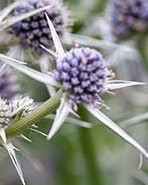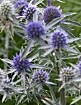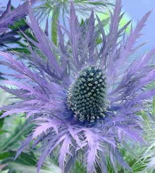 A native of the eastern Mediterranean where it grows in dry stony places, amethyst sea holly is one of the most common sea hollies in North America. It has pinnately parted basal leaves, light blue to purple branching stems, and small flowerheads surrounded by long sharply pointed bracts. Both flowers and bracts are silvery blue. More cold hardy than other species.