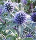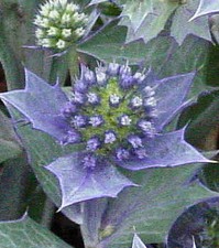 This compact sea holly is a native of southwestern Europe where it grows in rocky places. It has white veined gray-green, palmately divided leaves two inches long and blue-green to silver blue flowerheads that are ¾ inch long and subtended by much longer silvery bracts.
