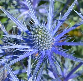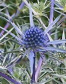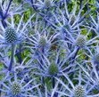 An old hybrid that may be the result of crosses between E.gigantum, E. alpinum, and E. planum, this sea holly most resembles E. alpinum. The lower leaves are heart-shaped, the upper ones palmately divided. The light blue flowerheads are 1.5 inches across and are subtended by stiff, spiny bracts. May need staking.