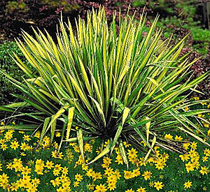 For a bold architectural look, yuccas are outstanding. Yucca ‘Golden Sword’ also adds color with its yellow leaves edged with green. The sword-like leaves grow in slow growing clumps that produce a spike of creamy white flowers in mid-summer giving added height to the garden. Cut the flower stalk to the ground after flowering to keep the combination looking good.