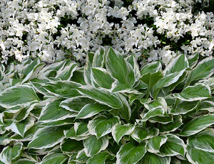 Make spring time special with the combination featuring a white azalea and a hosta with a white edge. This hosta is one of the earliest to emerge so will be showing off its emerald green leaves with margins that echo the color of the azalea. After the azalea has finished blooming the hosta continues into fall producing pale purple flowers on arching scapes in mid-summer. The azalea leaves turn yellow in fall and persist through the winter while the hosta dies back for winter dormancy. Both plants enjoy part shade and moist, well-drained soil.