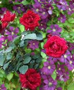 The climber Don Juan is one of the best red climbers but can be made even more exciting with the addition of clematis ‘Etoile Violette’. The vivid contrasting colors in rich jewel tones can make a garden wall, trellis, or arbor the focal point of the garden. With an abundance of long lasting flowers this duo will please for a long bloom time in summer. Both plants like full sun and fertile, medium moist, well-drained soil. Clematis like cool feet so plant it in the shade of the rose and let it grow out into the sun. They will both appreciate a mulch and a good dose of fertilizer throughout the season.