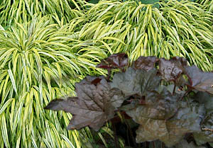These two herbaceous perennials will provide color in a shady spot all season long. The chocolate purple color of the wide coarse leaves of coral bells contrasts nicely with the bright yellow green of hakone grass’s delicate blades. Further interest is added by the difference in texture between the broad coarse leaves of coral bells ‘Palace Purple’ and the slender leaves of hakone grass. Plants grow well together in humusy, medium moist soil and part shade.