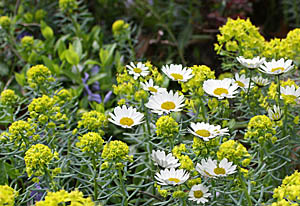 The appeal of simple white and yellow daisies is used here to create a charming combination with cypress spurge for the late spring garden. The acid yellow green bracts of cypress spurge’s flowerheads punctuate the yellow centers of dwarf camomille flowers while the foliage of the two plants contrasts in color. Summer interest is provided by the flower heads of cypress spurge that turn red and the lacy foliage of dwarf camomille. Cypress spurge grows aggressively and may wind its way in and around dwarf camomille. Grow this combination in full sun, dry to medium moist, well-drained soil.
