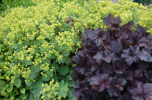 The foliage of these two herbaceous perennials make a lovely pair but there is more. Lady’s mantle bursts into bloom in late spring to early summer with a billowing mass of tiny chartreuse flowers that contrast well with the smooth purple leaves of ‘Black Beauty’ coral bells. The leaf shape of lady’s mantle echos the leaf shape of ‘Black Beauty’ coral bells to give give unity. This combination is most effective in cool climates (north of zone 7) where lady’s mantle keeps blooming through the summer and ‘Black Beauty’ holds its color. ‘Black Beauty’ even adds graceful sprays of delicate white flowers. Both plants thrive in sun to part sun to part shade and moist, well-drained soil but need afternoon shade and plenty of water in hot climates.