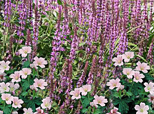 Rosy purple color is the theme for this long-blooming combination. The violet red of ‘Amethyst’ is echoed by the soft pink of ‘Bressingham Delight’ while contrast is provided by the differences in texture and shape. The spikes of ‘Amethyst’ provides a vertical element that is very different from the round form and flowers of ‘Bressingham Delight’. Further contrast is provided by the fuzzy leaves and fine textured flowers of ‘Amethyst’ and the smooth, silky flowers of cranesbill. Both plants do well with full sun and moist, well-drained soil.