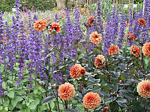 The smashing perennial combination of dark blue and apricot makes a dynamic statement in a sunny border from early summer to fall. Sage ‘Mystic Spires’ begins blooming in late spring and continues until frost. It might need cutting in mid season to rejuvenate it but it will then bloom into fall. Dahlia ‘David Howard’ first adds purple foliage to the scene followed by luscious flowers in early summer that continue to bloom into fall without deadheading. Grow in full sun, and medium moist, well-drained soil.