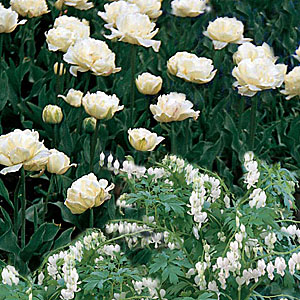 For a semi-shaded area in a white garden this late spring combination features the same color with contrast provided by the shape, texture and size of the flowers and leaves. The large, smooth, satiny petal of the tulip increase the delicacy and fragile look of the small heart-shaped flowers of the bleeding heart while the heavy gray-green leaves of the tulip create a subtle foil for the fern-like foliage of the bleeding heart. The tulips will go dormant after blooming, as will the bleeding heart in the South, so this combination is best planted with annuals or late growing perennials such as hostas or ferns to fill in the void.